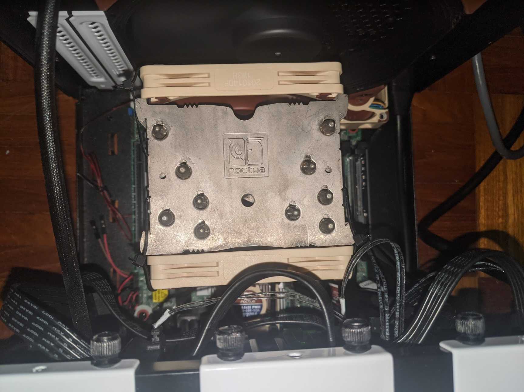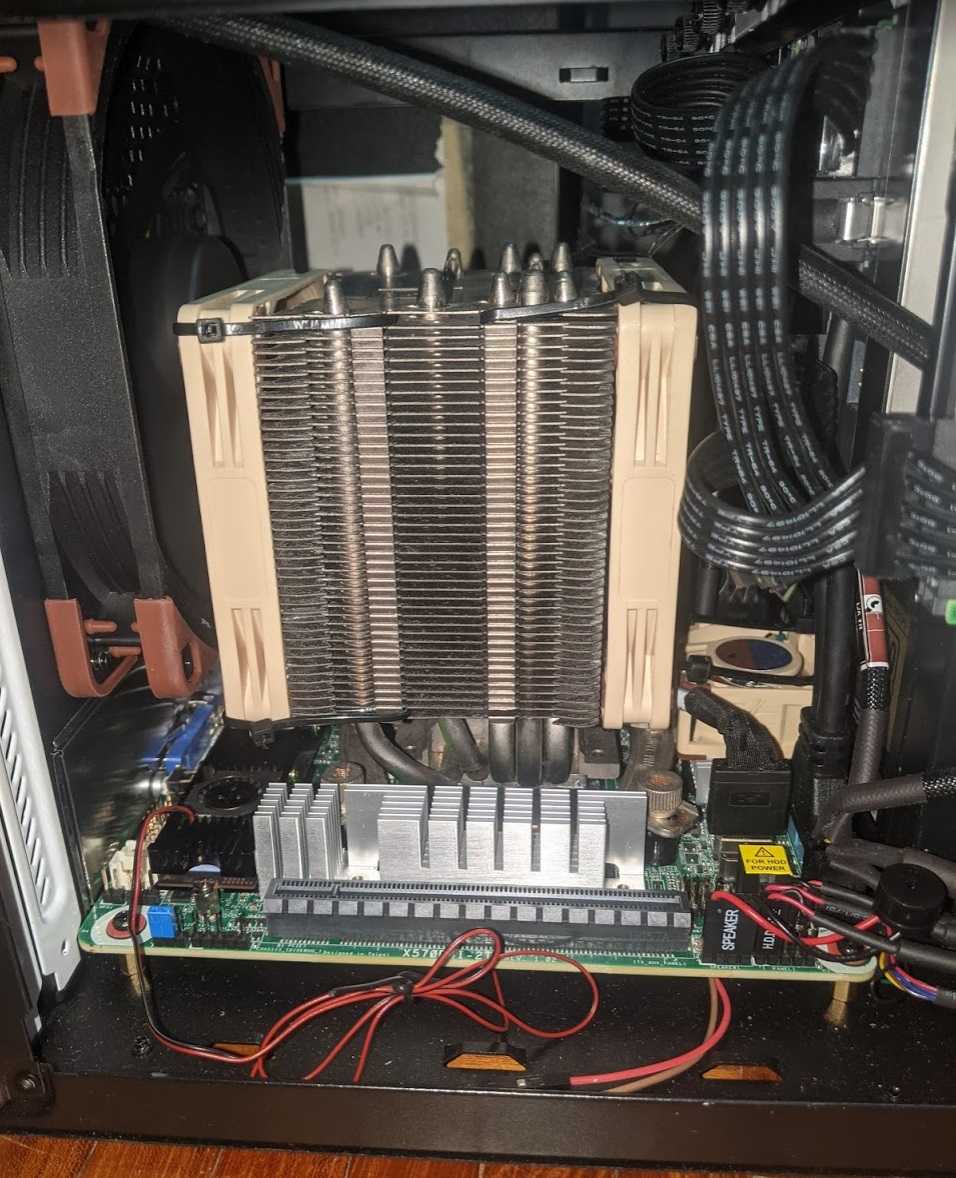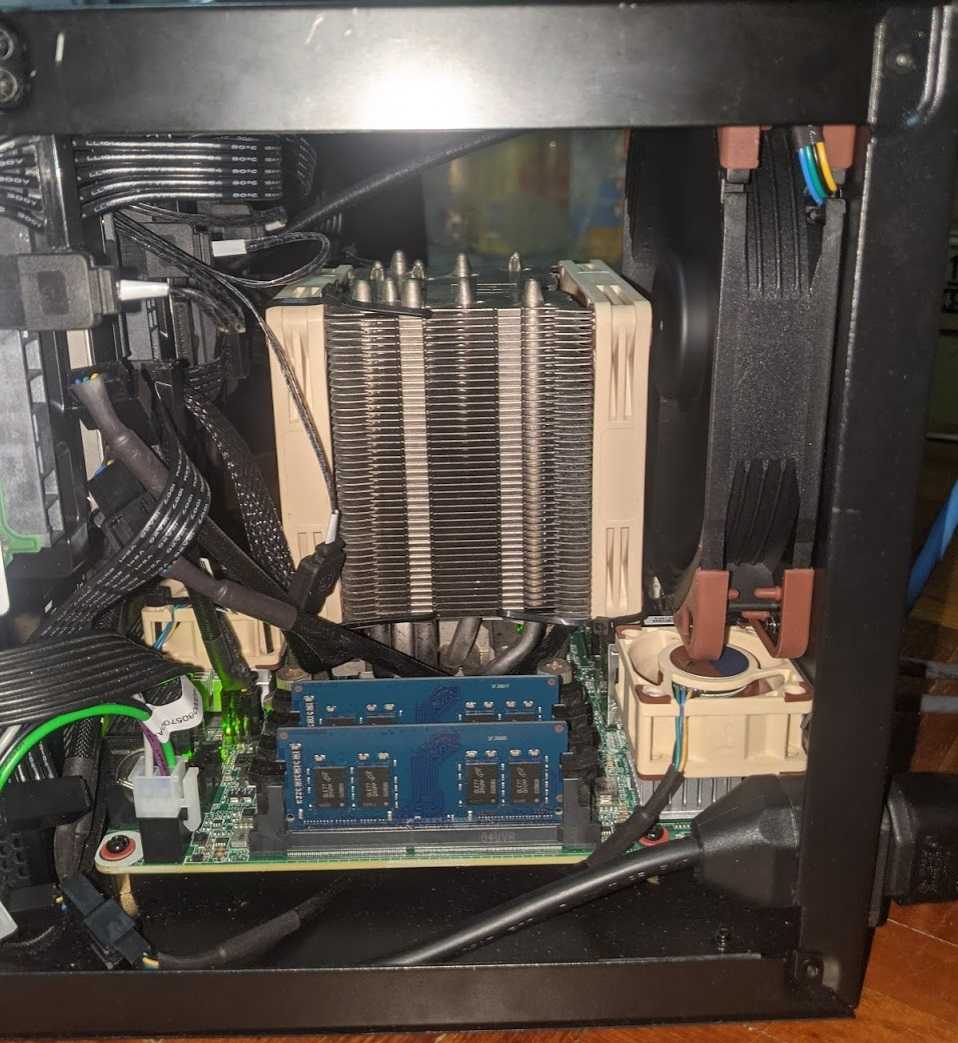 The motherboard itself is pretty interesting. It's basically an AMD AM4 board with LGA1156 cooler mount. The backplate is glued to the board so the easiest way to mount a cooler is to thread some M3x20mm screws through them instead of risking the removal of the backplate. It has 2 x Intel X550-AT2 10Gb LAN to boot. That's a lot of hardware to pack in such a small board. The folks over at LevelOneTechs found that the PCH and LAN chips were a little toasty and have added active cooling over the heatsinks. I have done the same with the Noctua A4x20, one of them zip tied and the other taped to the IO Plate with 3M VHB tape which you can see above in the Case section.